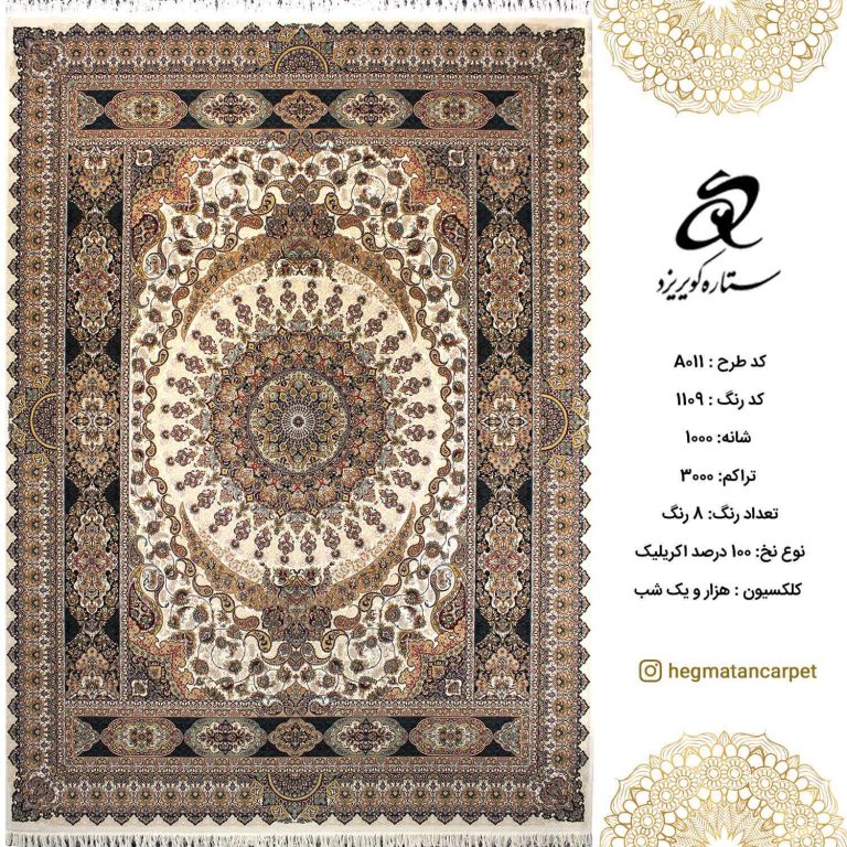 فرش ستاره کویر یزد 1000 شانه کد A011 و تراکم 1200و نوع نخ اکریلیک است که دارای 8 رنگ مختلف می باشد که مطابق با سلیقه روز طراحی و تولید گردیده است. فرش های 1000 شانه