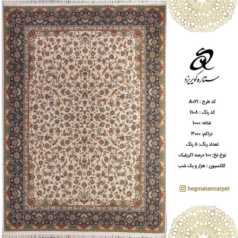 فرش ستاره کویر یزد 1000 شانه کد A021 و تراکم 3000 و نوع نخ اکریلیک است که دارای 8 رنگ مختلف می باشد که مطابق با سلیقه روز طراحی و تولید گردیده است. فرش های 1000 شانه