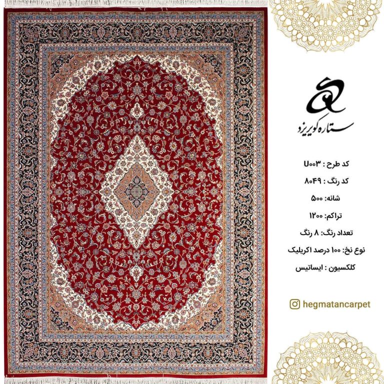 فرش ستاره کویر یزد 500 شانه کد U003 و تراکم 1200و نوع نخ اکریلیک است که دارای 8 رنگ مختلف می باشد که مطابق با سلیقه روز طراحی و تولید گردیده است. ضخامت فرش های 500 شانه بیشتر است به همین خاطر نرم تر هستند