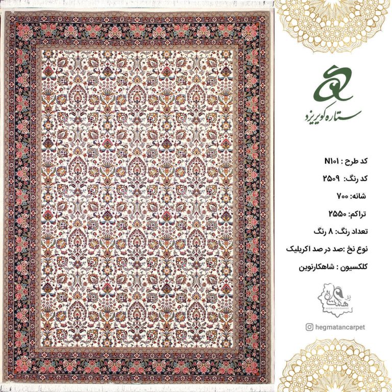 فرش ستاره کویر یزد 700 شانه کد N101 و تراکم 2550 و نوع نخ اکریلیک است که دارای 8 رنگ مختلف می باشد که مطابق با سلیقه روز طراحی و تولید گردیده است و بافت برجسته دارد