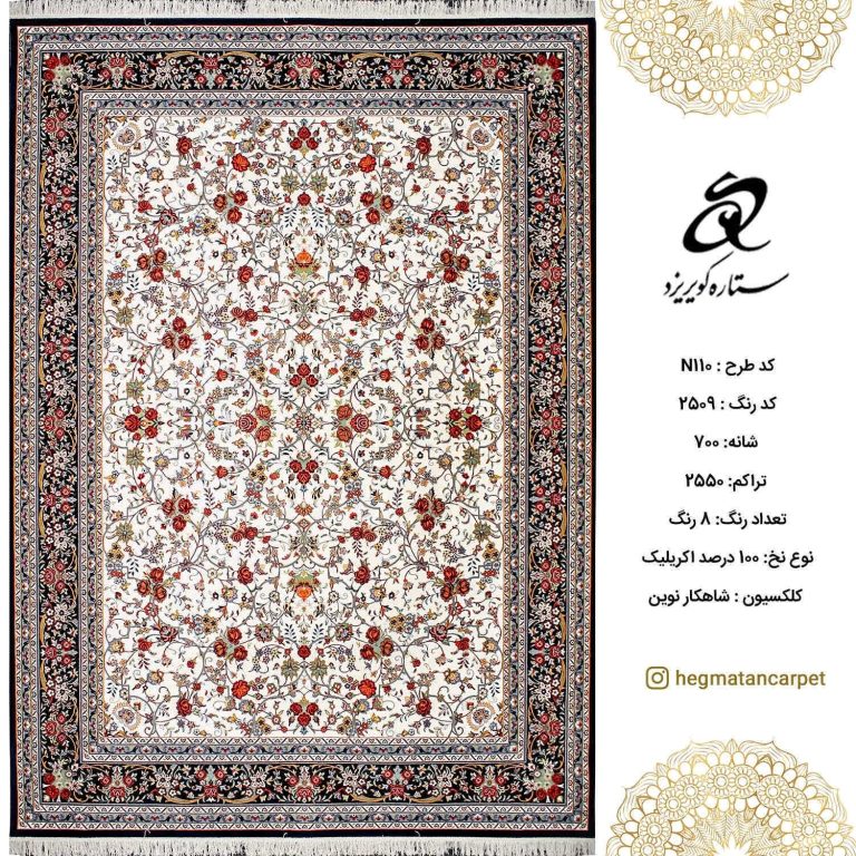 فرش ستاره کویر یزد 700 شانه کد N110 و تراکم 2550 و نوع نخ اکریلیک است که دارای 8 رنگ مختلف می باشد که مطابق با سلیقه روز طراحی و تولید گردیده است و بافت برجسته دارد