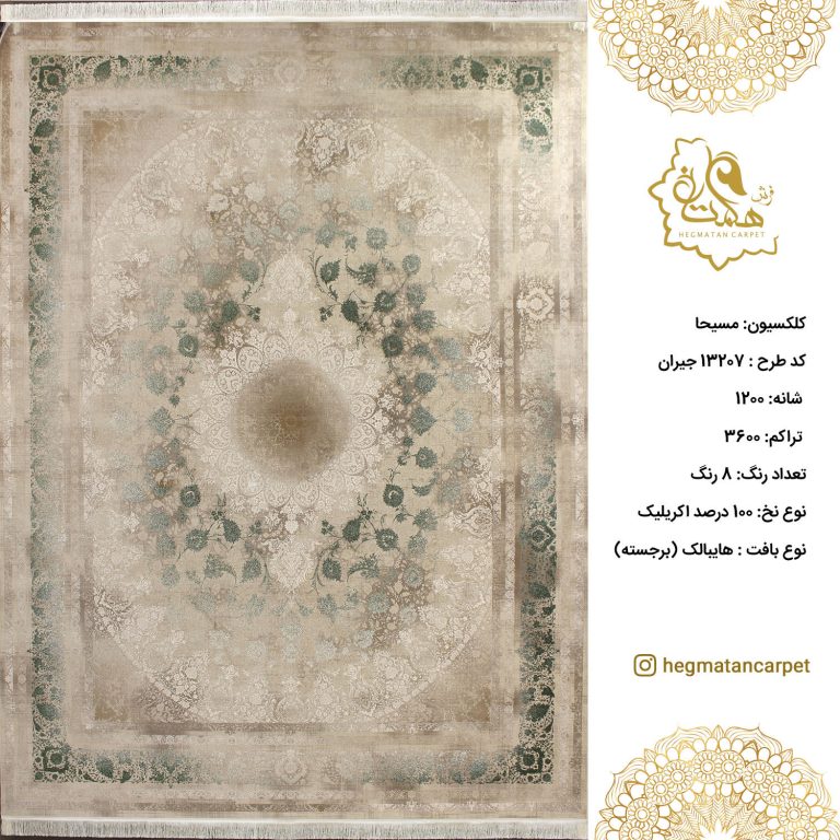فرش هگمتان 1200 شانه 13207 جیران و تراکم 3600 و نوع نخ صد در صد اکریلیک است که دارای 8 رنگ مختلف می باشد و مطابق با سلیقه روز طراحی و تولید گردیده است. فرش های 1200 شانه به خاطر تعداد شانه و تراکم بیشتر ذخامت کمتری نسبت به فرش های 700 شانه دارند و به همین خاطر نقش های آن وضوح بالاتری دارند و نازکتر به نظر می رسند.