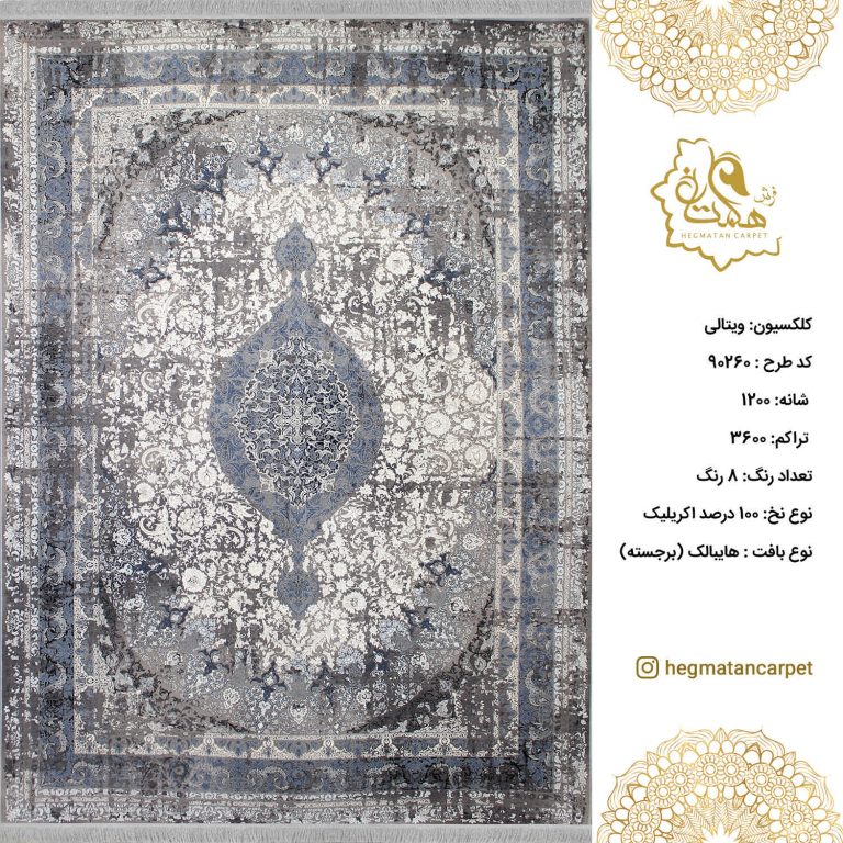 فرش هگمتان 1200 شانه 90260 ویتالی و تراکم 3600 و نوع نخ صد در صد اکریلیک است که دارای 8 رنگ مختلف می باشد و مطابق با سلیقه روز طراحی و تولید گردیده است. فرش های 1200 شانه به خاطر تعداد شانه و تراکم بیشتر ذخامت کمتری نسبت به فرش های 700 شانه دارند و به همین خاطر نقش های آن وضوح بالاتری دارند و نازکتر به نظر می رسند.