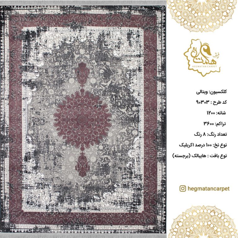 فرش هگمتان 1200 شانه 90303 ویتالی و تراکم 3600 و نوع نخ صد در صد اکریلیک است که دارای 8 رنگ مختلف می باشد و  مطابق با سلیقه روز  طراحی و تولید گردیده است. فرش های 1200 شانه به خاطر تعداد شانه و تراکم بیشتر  ذخامت کمتری  نسبت به فرش های 700 شانه دارند و به همین خاطر نقش های آن وضوح بالاتری دارند و نازکتر به نظر می رسند.