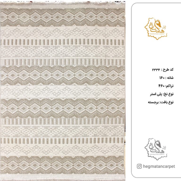 فرش هگمتان 160شانه کد 2334 و تراکم 460 نوع نخ پلی استر هایبالک است که مطابق با سلیقه روز طراحی و تولید گردیده است بافت متفاوتی دارد