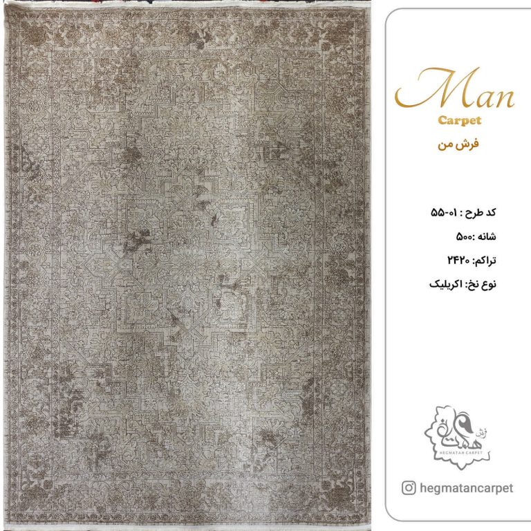 فرش هگمتان 500 شانه کد 01-55و تراکم 2420 نوع نخ اکریلیک است که مطابق با سلیقه روز طراحی و تولید گردیده است بافت متفاوتی دارد