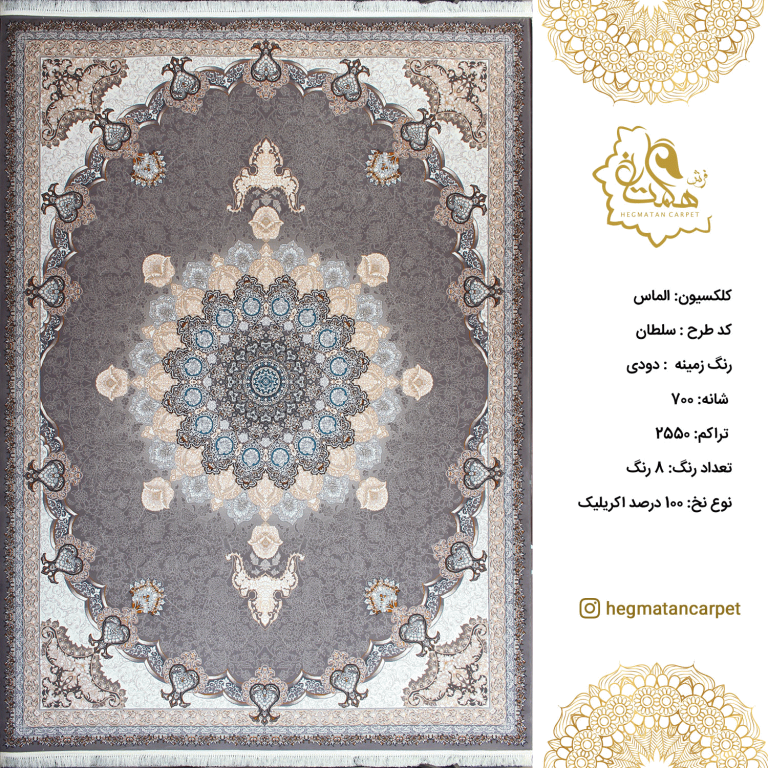 فرش هگمتان 700 شانه سلطان دودی و تراکم 2550 و نوع نخ صد در صد اکریلیک است که دارای 8 رنگ مختلف می باشد و مطابق با سلیقه روز طراحی و تولید گردیده است. فرش های 700 شانه به خاطر تعداد شانه و تراکم کمتر ذخامت بیشتری نسبت به فرش های 1200 و 1500 شانه دارند و به همین خاطر نرمتر به نظر می رسند