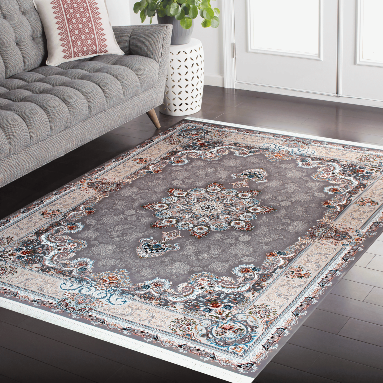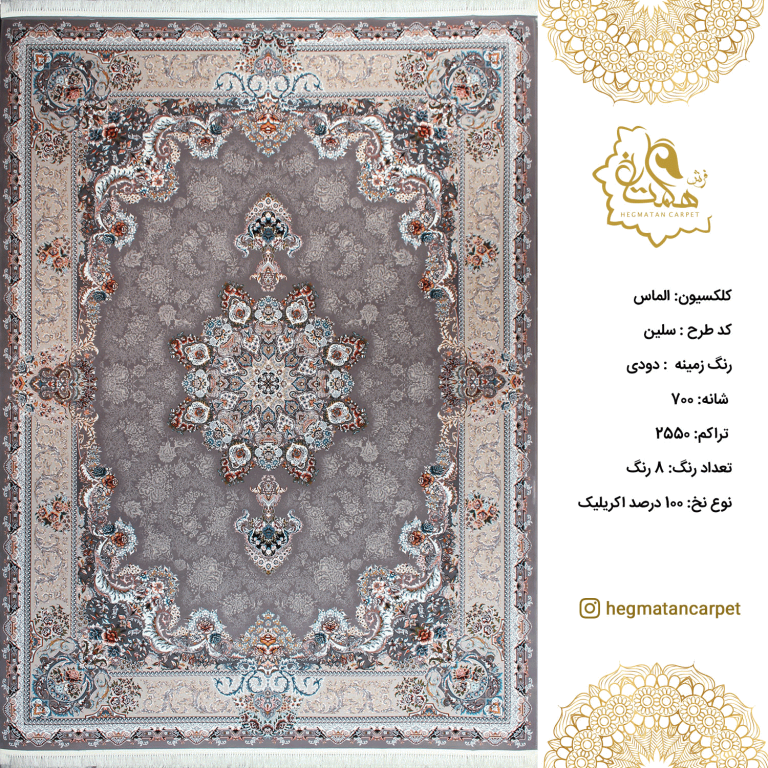 فرش هگمتان 700 شانه سلین دودی و تراکم 2550 و نوع نخ صد در صد اکریلیک است که دارای 8 رنگ مختلف می باشد و مطابق با سلیقه روز طراحی و تولید گردیده است. فرش های 700 شانه به خاطر تعداد شانه و تراکم کمتر ذخامت بیشتری نسبت به فرش های 1200 و 1500 شانه دارند و به همین خاطر نرمتر به نظر می رسند