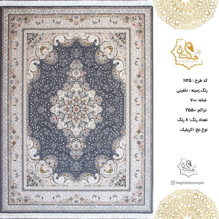 فرش هگمتان 700 شانه 1125 دلفینی و تراکم 2550 و نوع نخ صد در صد اکریلیک است که دارای 8 رنگ مختلف می باشد و  مطابق با سلیقه روز  طراحی و تولید گردیده است. فرش های 700 شانه به خاطر تعداد شانه و تراکم کمتر ذخامت بیشتری نسبت به فرش های 1200 و 1500 شانه دارند و به همین خاطر نرمتر به نظر می رسند